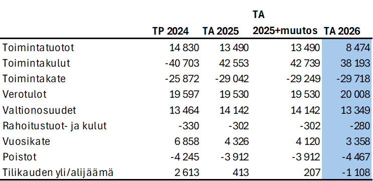”Vuoden 2026 talousarvio on laadittu ajassa, jossa kuntatalouden haasteet jatkuvat. Yleisen taloudellisen tilanteen epävarmuus heijastuu kuntatalouteen – verotulojen kasvua joudutaan odottamaan ja lisääntyvä työttömyys aiheuttaa aikaisempaa suurempia kustannuksia kunnille.