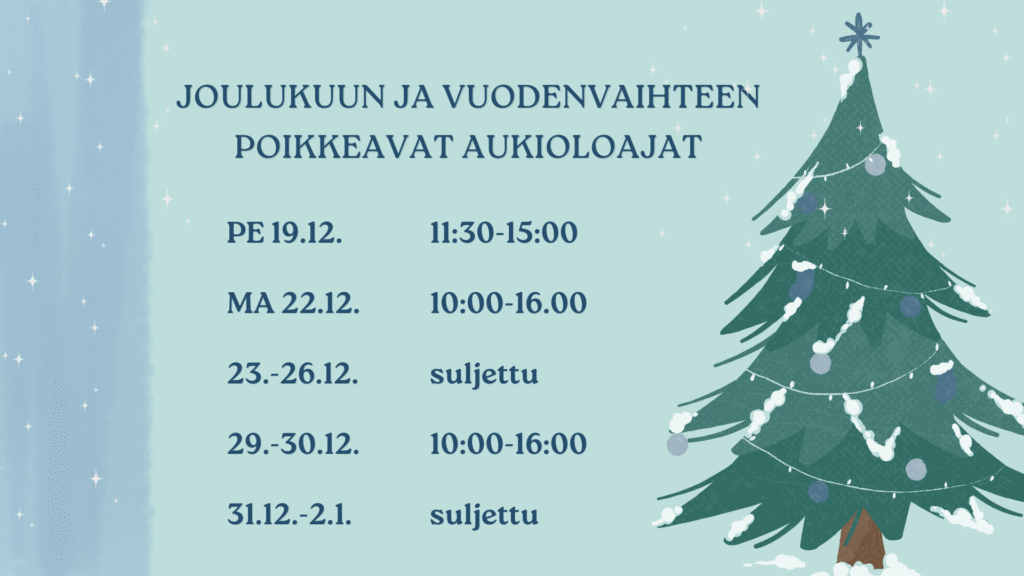 Pe 19.12. 11:30-15:00, Ma 22.12. 10:00-16:00, 23.-26.12. suljettu, 29.-30.12. 10:00-16:00, 31.12.-2.1. suljettu