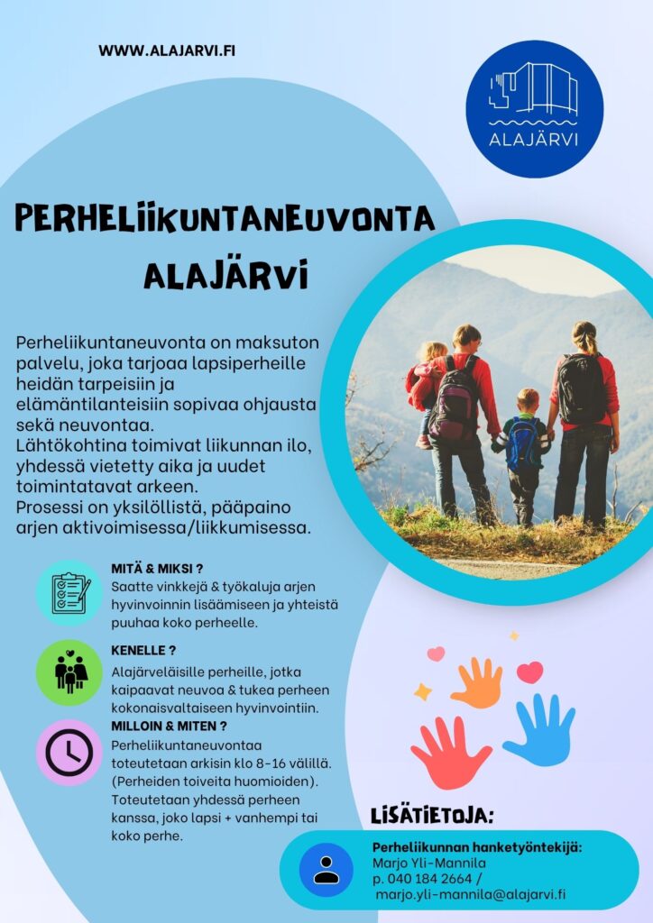 Alajärven kaupungin liikuntapalveluilla on menossa perheliikuntaneuvonnan hanke, jonka tavoitteena on mm. luoda perheliikuntaneuvonnalle palvelupolkumalli ja toimintatavat sekä toteuttaa perheliikuntaneuvontaa. (Testi perheitä).