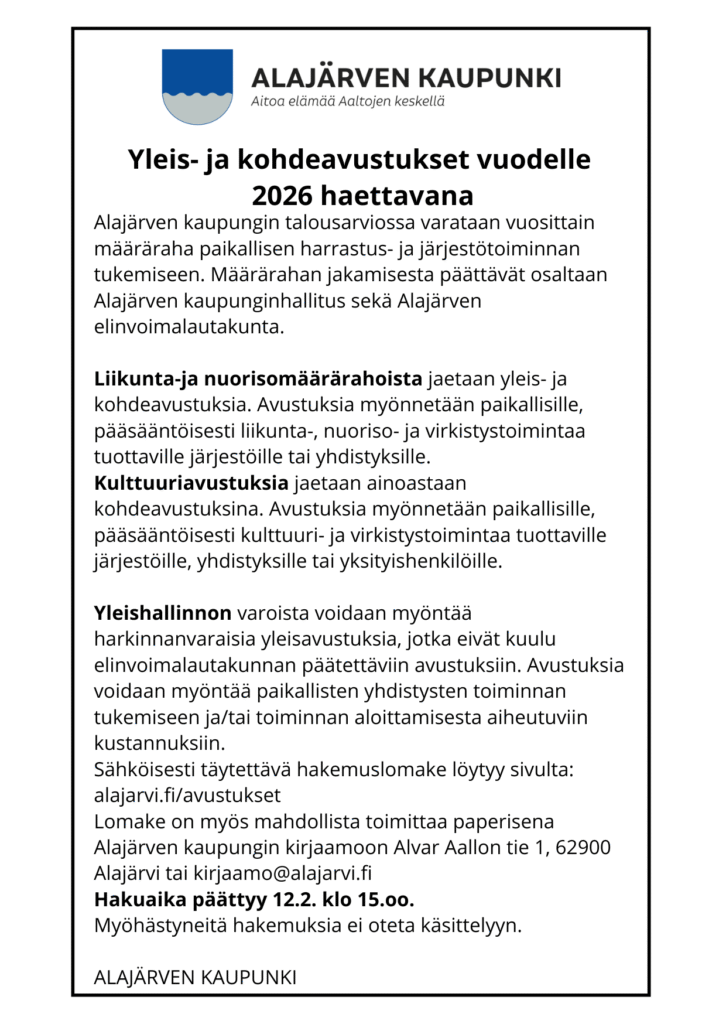 Avustuksia saaneiden tahojen on hyvä huomata, että yleisavustukset maksetaan suoraan hakijan ilmoittamalle tilille. Sen sijaan myönnetyn kohdeavustuksen voi saada vain jälkikäteen jo maksettuja maksukuitteja vastaan. Tiedot tulee ilmoittaa kaupungin kirjaamoon kirjaamo@alajarvi.fi. Kohdeavustukset tulee hakea hyvissä ajoin ennen avustusvuoden päättymistä.
